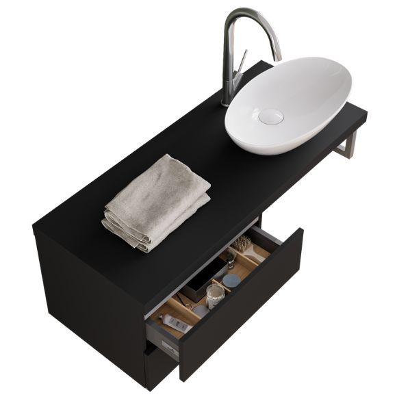 Und auch beim ultimativen Minimalismus in Form von Waschtischplatten müssen Sie nicht auf Stauraum verzichten. Die zusätzlichen Schränke im grifflosen Push to Open-Design können sich über die gesamte Länge der Arbeitsplatte  oder nur in ausgewählte Bereichen integrieren.