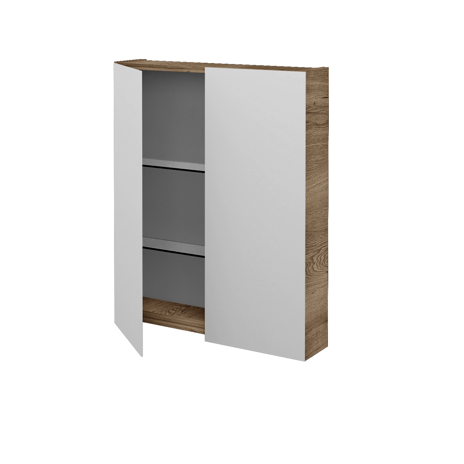 Der Spiegelschrank STING GA2E 60 ist zweitürig mit doppelseitigen Spiegeln konzipiert. Diese werden mit Markenscharnieren mit gedämpftem Verschluss am Korpus befestigt, die auf einer speziellen Schiene montiert sind und direkt von BMF entwickelt wurden.