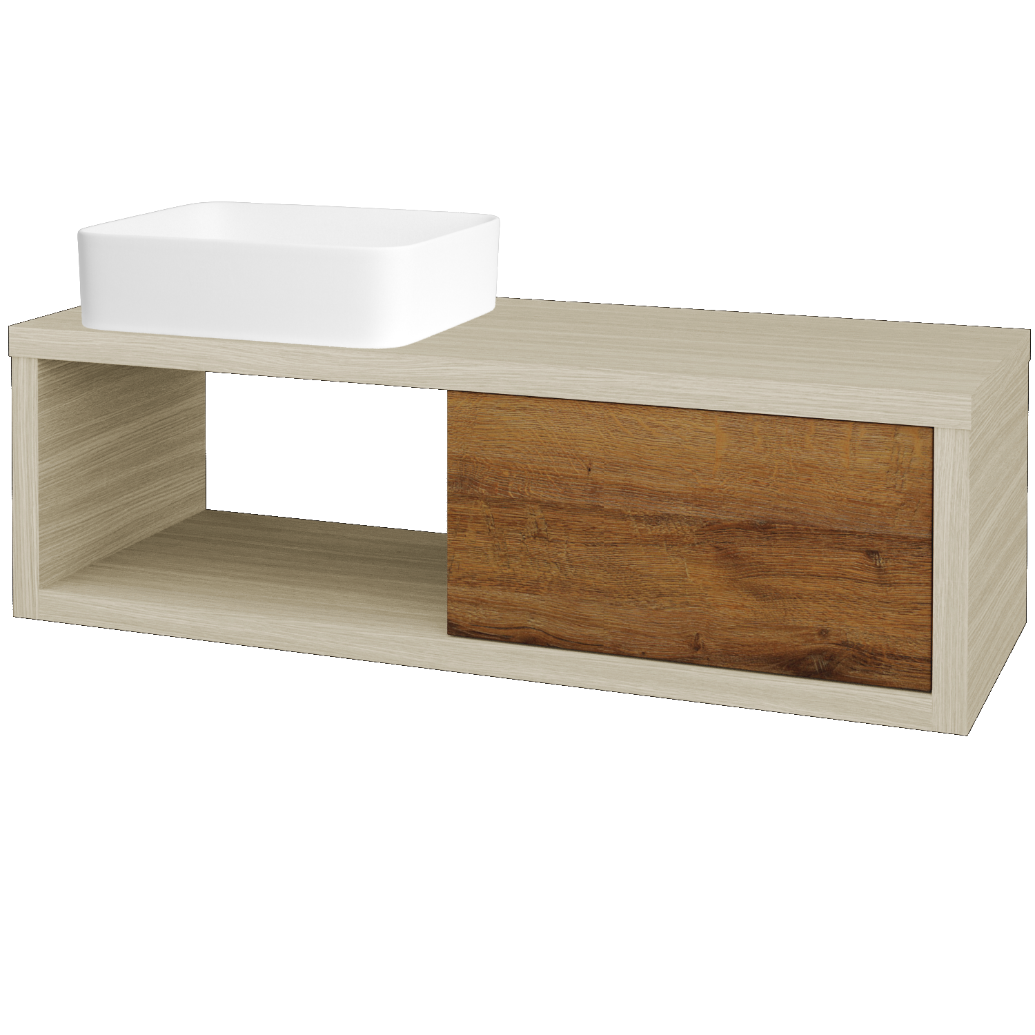 Sie können nicht nur mit der Aufteilung des Waschbeckens, der Schublade und des leeren Regals im Badezimmer spielen, sondern auch mit deren Farbgestaltung. Sie können verschiedene Dekore für den Korpus und die Schubladenfront verwenden. Sie haben die Wahl zwischen verschiedenen Holzdekoren, modernen Betondekoren in verschiedenen Farbtönen, Grundfarbtönen in Hochglanz und auch Farbtönen, die Sie aus den endlosen Farbpaletten von RAL/NCS auswählen können.