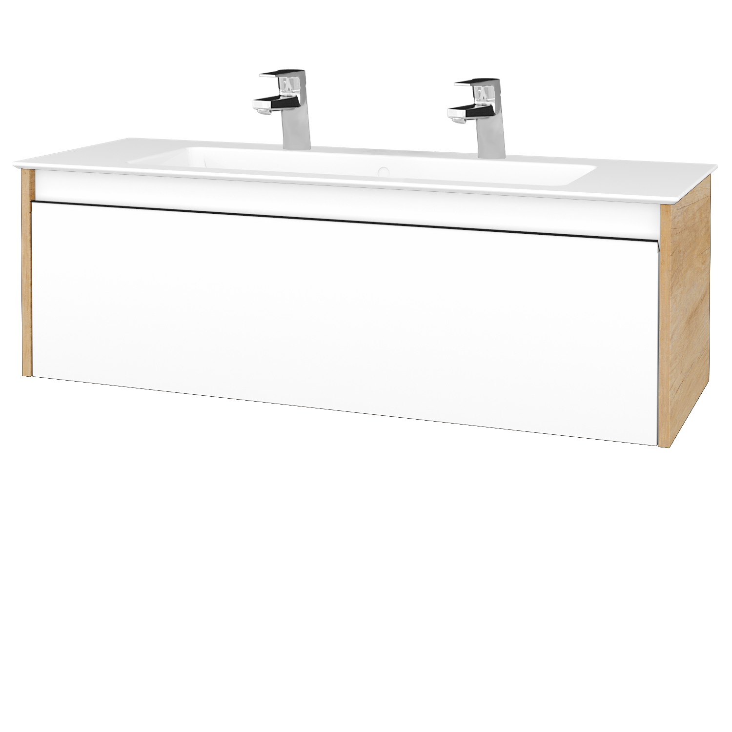 Waschtischunterschrank LOGI SZZ 120 (Waschtisch Pura 120 mit 2 Hahnlöchern)  - D15 Eiche Nebraska - N01 Weiß Hochglanz Express Lieferung Abgesenkter Siphon
