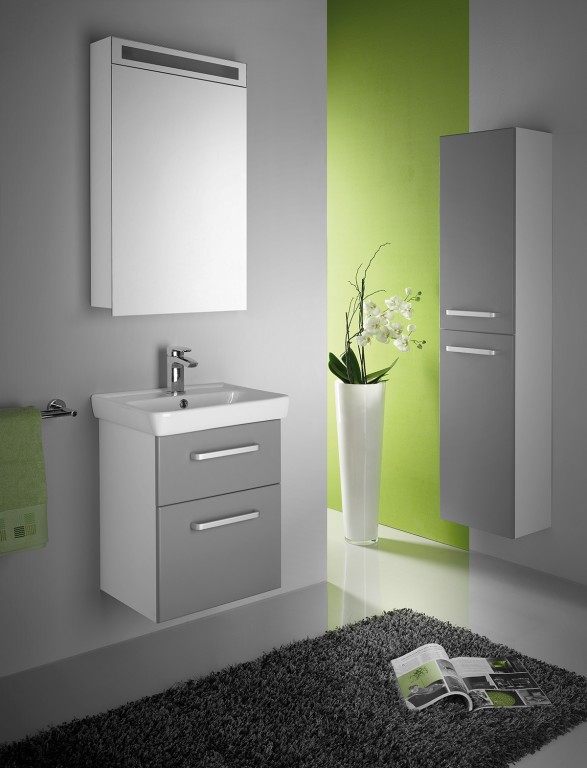 Hängender Badezimmerschrank GO SZZ2 60 mit Waschbecken MINI 60 (im Preis inbegriffen). Der Schrank besteht aus einer größeren (unten) und einer kleineren (oben) Schublade – die innere Form der oberen kleineren Schublade ist dem Siphon angepasst. Es gibt zwei Typen von Griffen zur Wahl. Den Korpus dieses Schrankes bilden weiße LTD Platten von hoher Qualität, die Vorderseite ist in Grau Matt lackiert.